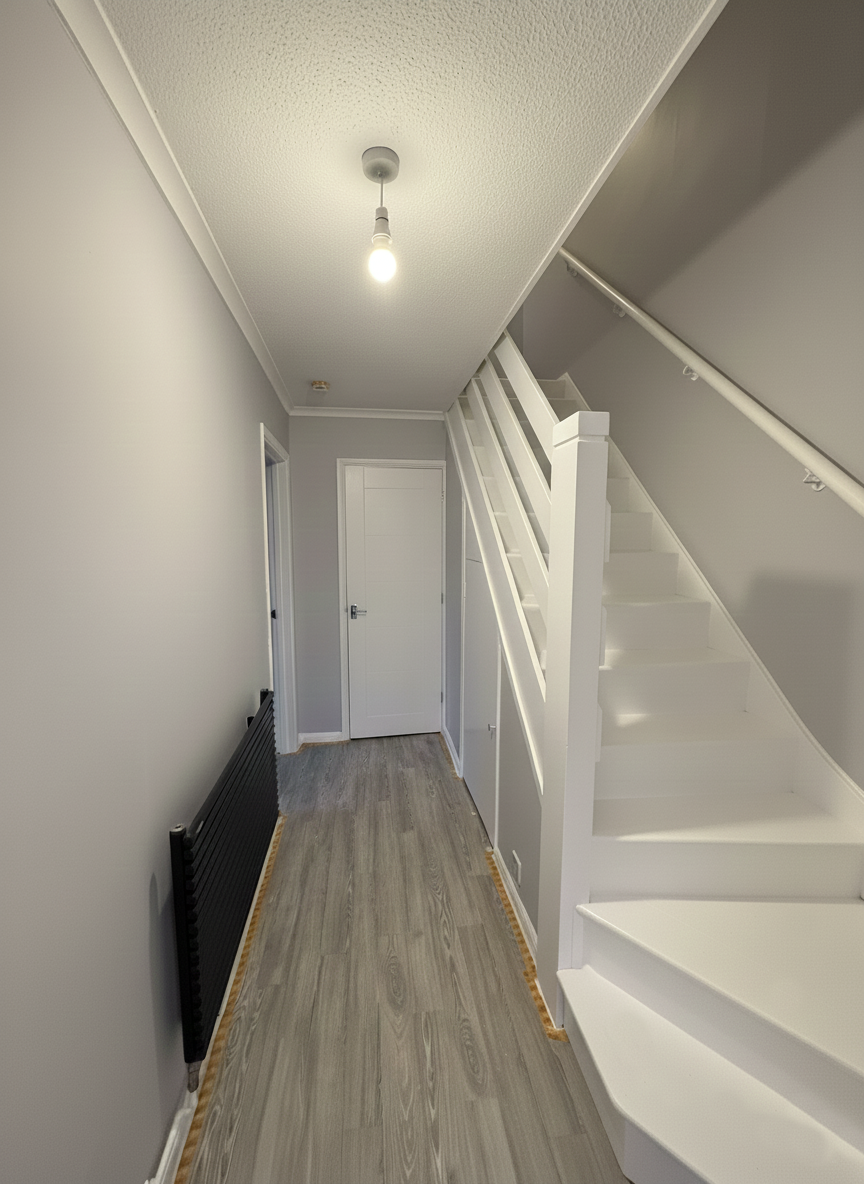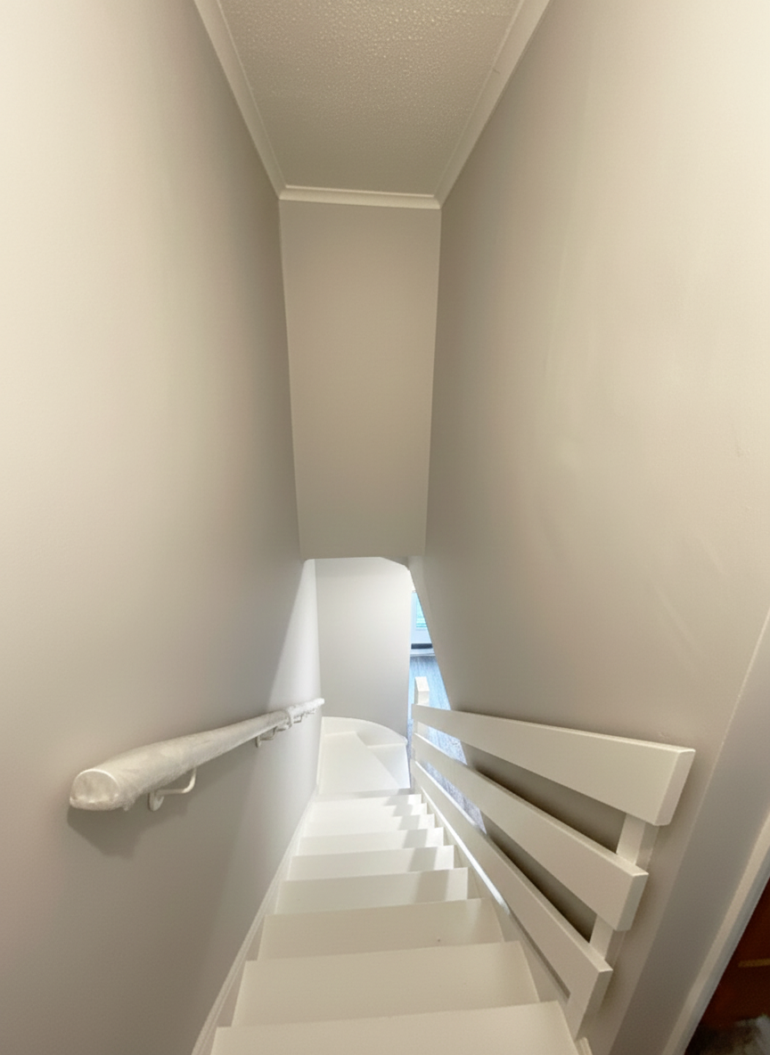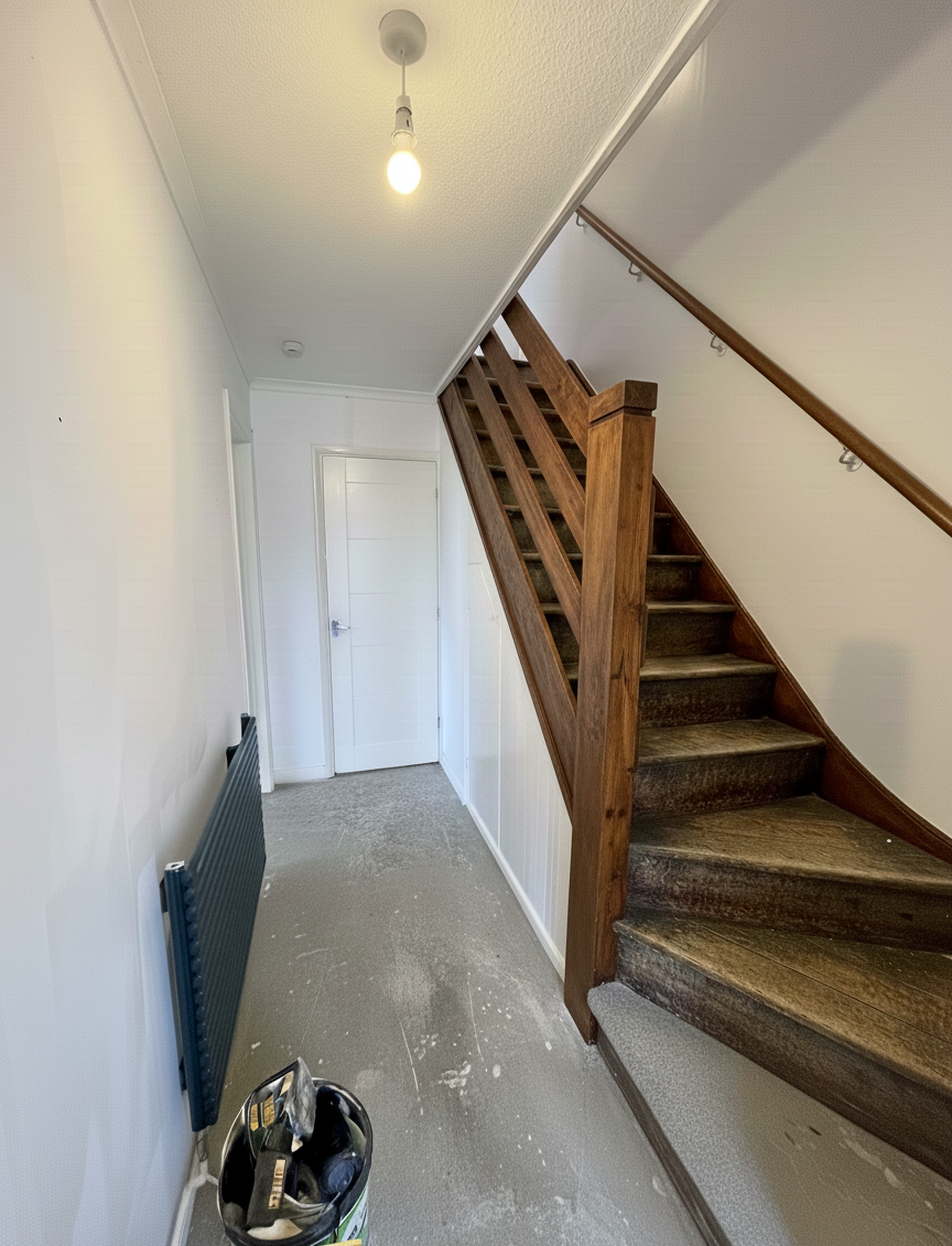 We keerden terug naar een van onze vaste klanten om schilderwerken uit te voeren voor de volledige woning. Na het stucwerk (stukadoor) hebben we alle muren zorgvuldig geschuurd. Daarnaast hebben we ook de deuren en de trap geschilderd om tot dit perfecte eindresultaat te komen. Enkele foto’s tonen de verschillende fases van het werk.